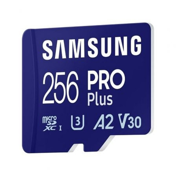 Samsung PRO Plus MB-MD256SA/EU. Capacidad: 256 GB, Tipo de tarjeta flash: MicroSD, Clase de memoria flash: Clase 3, Tipo de memoria interna: UHS-I, Velocidad de lectura: 180 MB/s, Velocidad de escritura: 130 MB/s, Clase de velocidad UHS: Class 3 (U3), Clase de velocidad de vídeo: V30. Funciones de protección: Protección contra campos magnéticos, Resistente a la temperatura, Resistente al agua, A prueba..., Color del producto: Azul