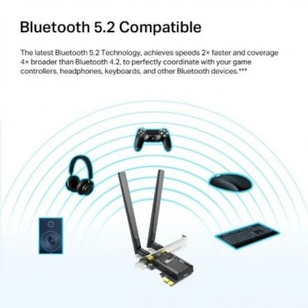 TP-LINK AX1800 DUAL BAND WI-FI 6 BLUETOOTH 5.2 PCI EXPRESS ADAPTER SPEED: 1201 MBPS AT 5 GHZ + 574 MBPS AT 2.4 GHZ SPEC: 2× HIGH GAIN EXTERNAL ANTENNAS FEATURE: MU-MIMO, OFDMA, WPA3, BLUETOOTH 5.2