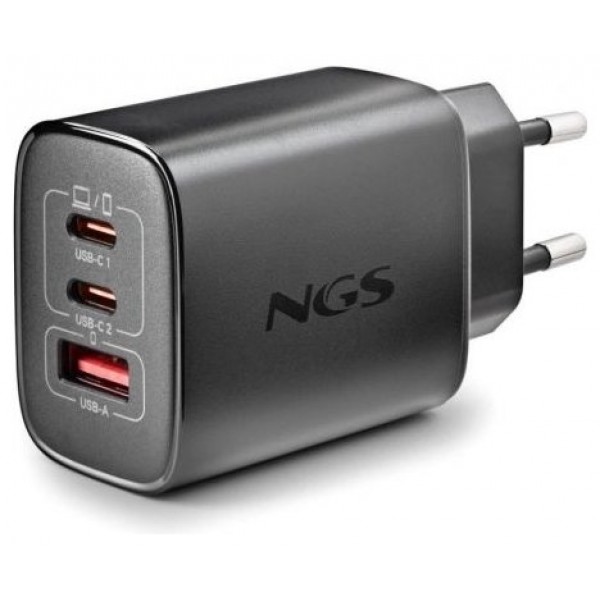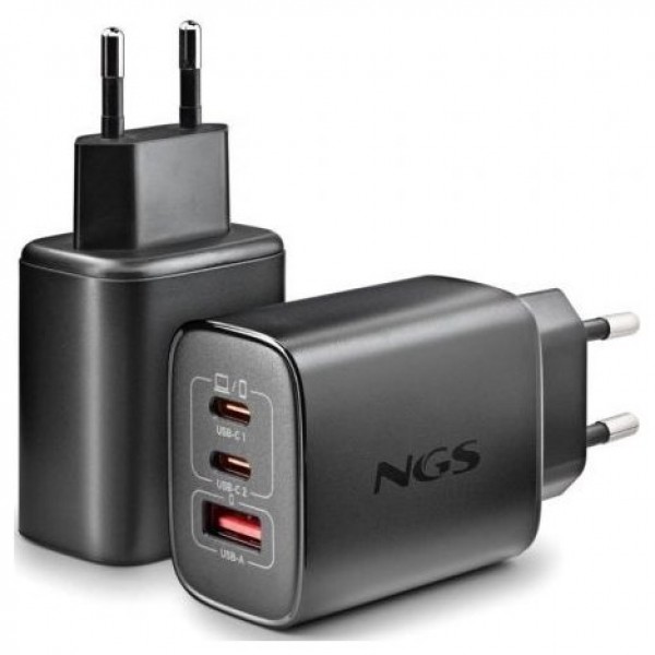 - Cargador GaN de pared con 2 salidas USB-C (PD & PPS) y una salida USB-A QC 3.0 de 65W de potencia máxima para cargar dispositivos de manera rápida y eficiente.