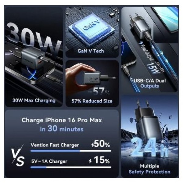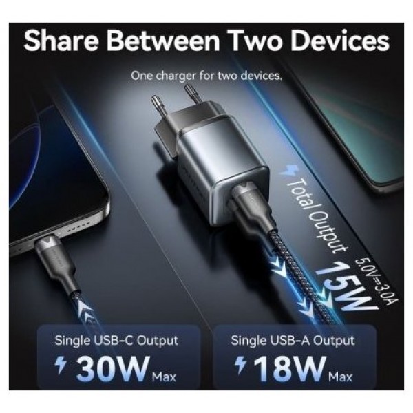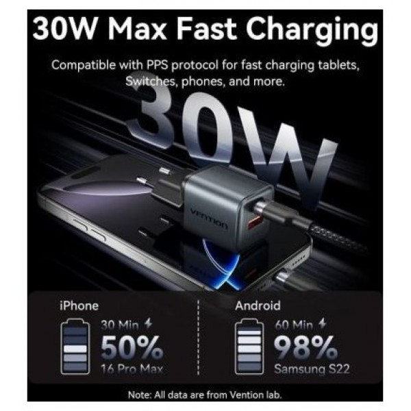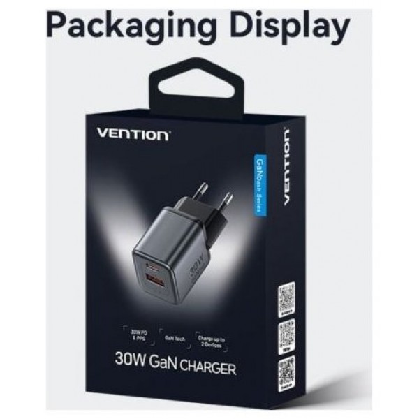 Vention Cargador GaN de 2 puertos USB (C+A) (30 W/18 W) con enchufe UE