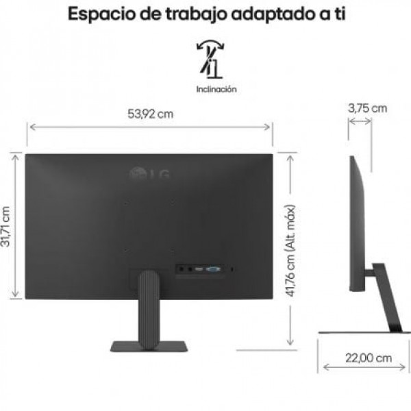 | Características | - HDR 10 - Debilidad de Color - PBP - A prueba de parpadeos - Sincronización dinámica de acciones - Estabilizador de negro - Otros (Características): Customizado, FPS, RTS, Vívido, Lectura, Efecto HDR, Cine, Asistente de Color - Modo Lector - VRR - Super Resolución - Efecto HDR Alimentación - Consumo de energía (máx.): 16 W - Consumo de energía (modo de reposo): < 0,5 W - Consumo de energía (típ.): 13 W - Consumo de energía (CC apagada): < 0,3 W - Entrada CA: 100-240 V (50/60 Hz) - Tipo: Alimentación Externa (Adaptador a Red) - Salida CC: 19V 1.3A (24W) Características Mecánicas - Ajustes de posicion de la pantalla: Inclinación (eje horizontal) - Diseño sin bordes: 3 Lados con Diseño de Marcos Ultrafinos - Montaje en pared: 100 x 100 mm Dimensiones y peso - 539,2 x 417,6 x 220 mm - 3,2 kg |