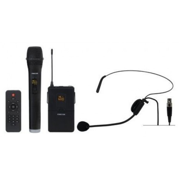 - 2 micrófonos inalámbricos UHF, 1 de mano y 1 de cabeza (650 MHz y 660 MHz).