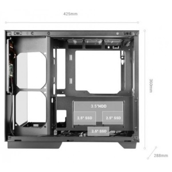 Pensada para configuraciones extremas, admite hasta 9 ventiladores y sistemas de refrigeración líquida de hasta 360 mm (dimensiones máximas: 395×120×52 mm). Su diseño interno favorece un flujo de aire continuo que mantiene temperaturas estables, incluso bajo cargas intensivas, asegurando un rendimiento constante y duradero.