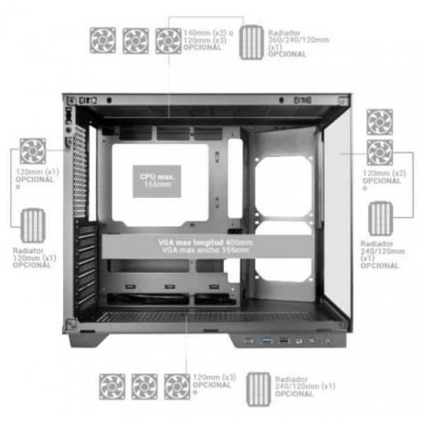 INT: 2x2"5, 2x3"5/ 2xUSB3.0, 1xUSB3.1 Tipo-C/ Audio In/Out/ Compatible con placas mATX y mITX de con..
