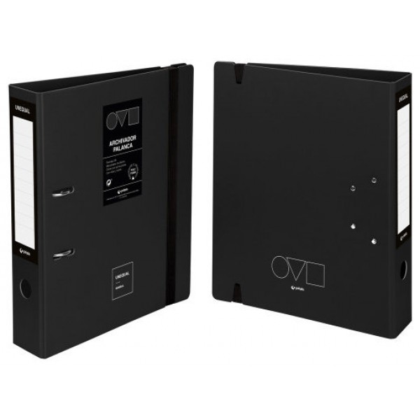 Archivador A4 65 mm Unequal Minimal Color negro. Este archivador tiene sus cubiertas realizadas en polyfoam, un material resistente y ultraligero. Permite una apertura 360º y cuenta con un tarjetero en lomo con cartulina impresa pegada, mecanismo de palanca niquelado, ollao y rados. Tiene también un práctico cierre con goma plana, que impedirá que se pierdan todos sus documentos.
