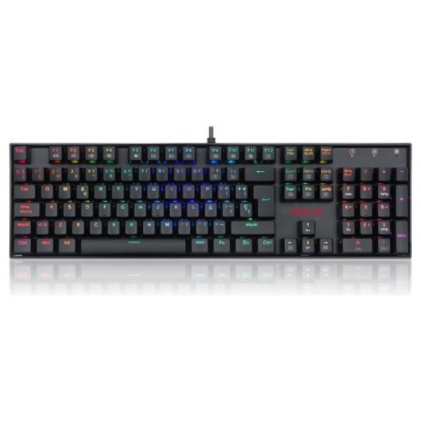 K551RGB MITRA Switches Redragon BlueEstá equipado con tecnología Redragon, en este caso, los switches MK1 Blue Box, de click audible y con activación al ejercer solo 50 gramos de fuerza sobre la tecla, hacen del Mitra un teclado que acompaña cualquier escritura o juego.Iluminación RGBPorque no todo es tecnicismo, también nos importa la estética: el Mitra K552 posee retroiluminación real LED RGB con 16.8 millones de nítidos colores para transformar el teclado en TU teclado.Tecla de bloqueo de WindowsComo su nombre lo dice, esta tecla añade funcionalidad al teclado, evitando tocar accidentalmente la tecla que cierre nuestro juego mientras nos encontramos en el punto clave de la partida.ConstrucciónLa construcción del teclado está realizada sobre ABS reforzado y placa de acero, combinado con teclas moldeadas por inyección láser de doble disparo y posteriormente grabadas, generan un producto durable y de excelente calidad, ideal para uso intensivo.Su cable de 1.8 metros resiste hasta 12kg de carga continua y hasta 10.000 flexiones bruscas.Estructura real antisalpicaduras que protege al usuario de derrames accidentales sobre nuestro periférico, drenando el líquido por la parte posterior de la base del teclado.Por último, pero no menos importante: todos los teclados Redragon poseen bases antideslizantes que aseguran la rigidez del periférico en el lugar que hayamos decidido colocarlo.Tecla FNLa inclusión de la tecla FN admite el uso de atajos multimedia que aportan al comfort del usuario en todo momento, que jamás se vea interrumpido por accidente el punto clave de la partida.Software independienteEl software independiente del Redragon Mitra nos permite configurar a gusto y confort del usuario la iluminación de nuestro periférico. No olvidemos que podemos guardar perfiles dentro de la memoria incorporada dentro del teclado.ExtrasEl Mitra incluye adicionalmente un keypicker, switches intercambiables y pinza extractora. ESPECIFICACIONES TÉCNICAS:- Tipo Teclado: Mecánicos- Tipo Switch: Redragon Blue, táctil con click audible, fuerza de actuación 50 gr- Teclas Multimedia: Si, a tráves de tecla FN- Teclas Macro Dedicadas: No- Bloqueo Tecla Windows: Si- Tamaño teclado: Full Size- Reposa Muñecas: No- Retroiluminado: Si, RGB Chroma- Cable: Goma, reforzado. Soporta 12kg y 10000 flexiones. USB enchapado en oro y filtro anti interferencias- Matriz: 100% Anti-Ghosting con Full Key Rollover- Construcción: Plástico ABS reforzado y placa de acero- Anti salpicaduras: Si- Distribución: Español Latinoamerica- Peso: 1.30 kg- Dimensiones: 43.5x12.3x3.7 cm- Extras: Teclas moldeadas por inyección doble disparo y grabadas con láser., keypicker, switches intercambiables - Software: Si