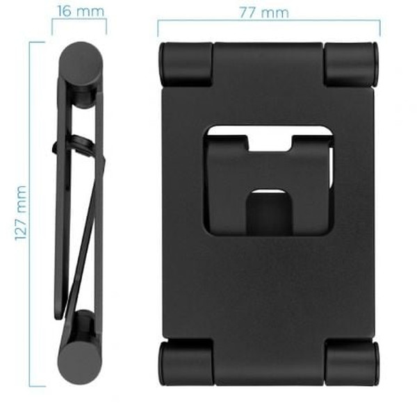 | Características | - Soporte de mesa ajustable y giratorio para teléfono / tablet de hasta 10” - Material: Fabricado en aleación de aluminio - Dispone de almohadillas de silicona antideslizantes, para proteger de arañazos y deslizamientos. - Plegado compacto del soporte para facilitar su guardado y transporte. - Medidas del producto plegado: 77 x 127 x 16 mm - Color: Negro - Peso: 0,218 kg |