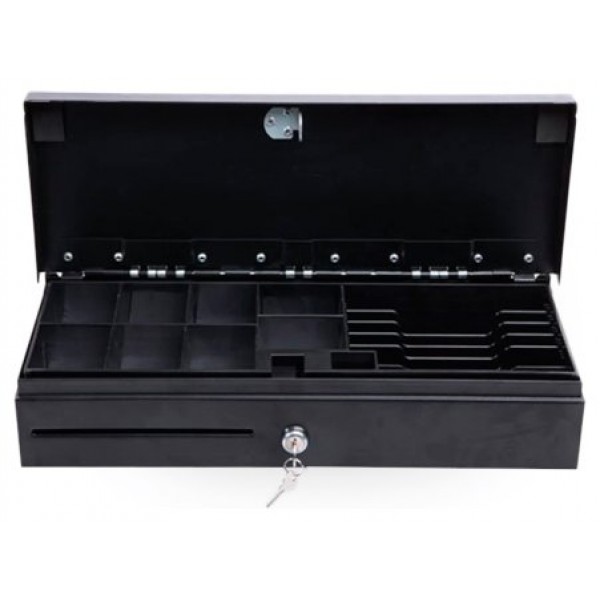 Cajón de tamaño reducido (330 x 335 x 90 mm). 8 compartimentos de monedas y 4 de billetes.Apertura e..