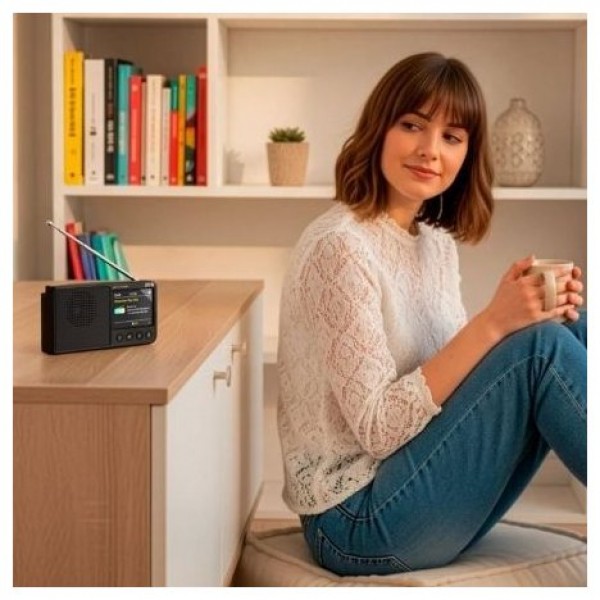 Radio digital DAB+ y FM con amplia pantalla TFT de 2,4” a color, con DAB+ y FM RDS (Radio Data System) para ver en ella la emisora, la hora, las funciones activas y más. 80 presintonías, sintonización fácil, batería recargable con hasta 7h de autonomía, función despertador y altavoz bluetooth de 2W.