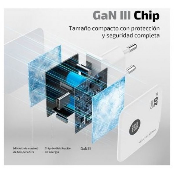 Cargador ultrarrápido con tecnología GaN Power Delivery 3.0 (PD) 20W, color blanco. Carga hasta un 400% más rápido que un cargador estándar de 5W. Compatible con dispositivos anteriores. Conector tipo USB-C de 3A. Este cargador permite cargar dispositivos como tabletas, móviles, consolas, baterías, auriculares, etc.