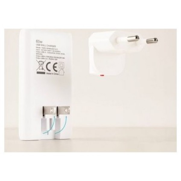 Cargador de viaje Tipo C y Tipo A, GaN 65W, USB-C/PD + USB-A/QC, Blanco