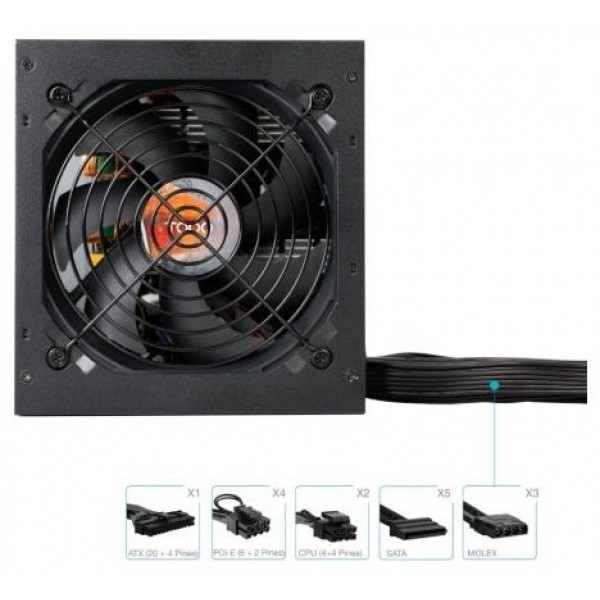 - Conectores: 1 conector ATX (24 pines) - longitud exterior 550 mm, 2 conector CPU (P8 4+4 pines) - longitud exterior 600 mm, 4 conector PCI-E (P8 6+2 pines) - longitud exterior 550+150 mm, 5 conectores SATA y 3 MOLEX - longitud exterior 550+150+150+150 mm
